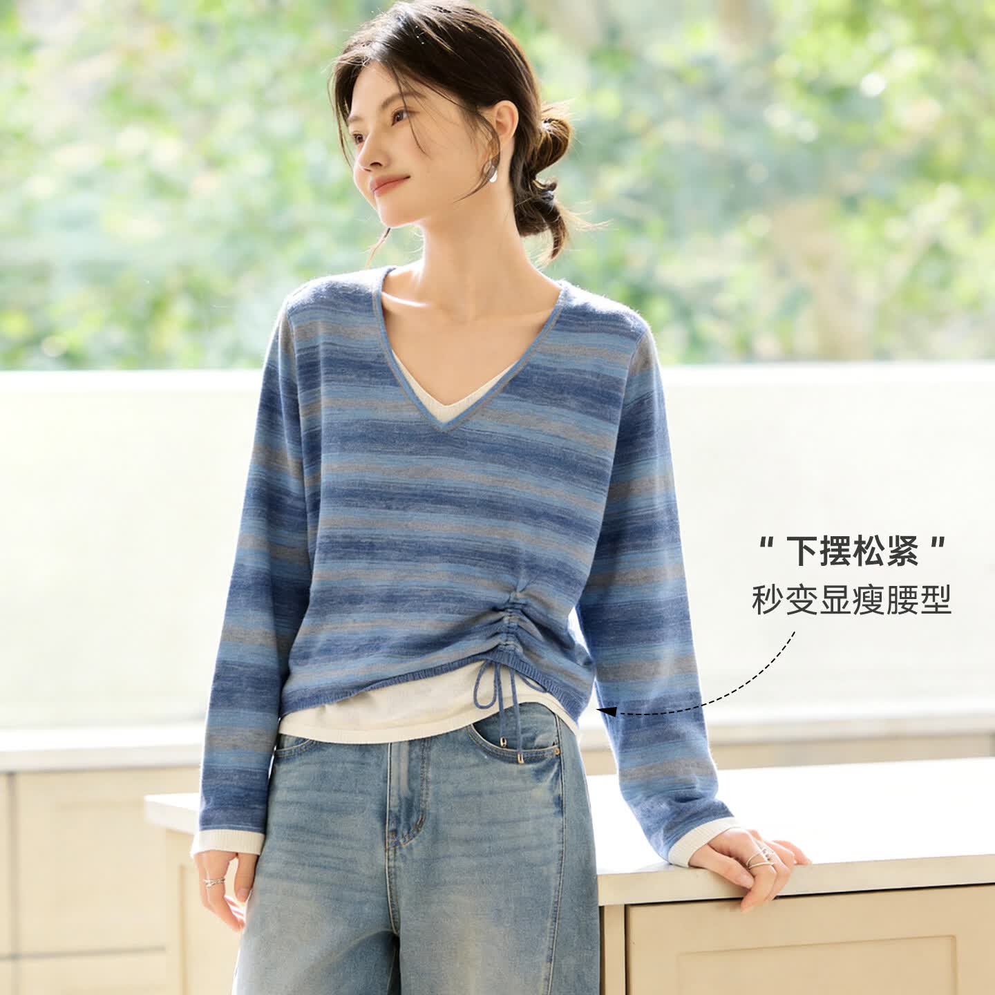 百家好(Basic House)高级条纹假两件针织衫v领抽绳温柔风长袖上衣春夏新款显瘦女装 海洋蓝 L